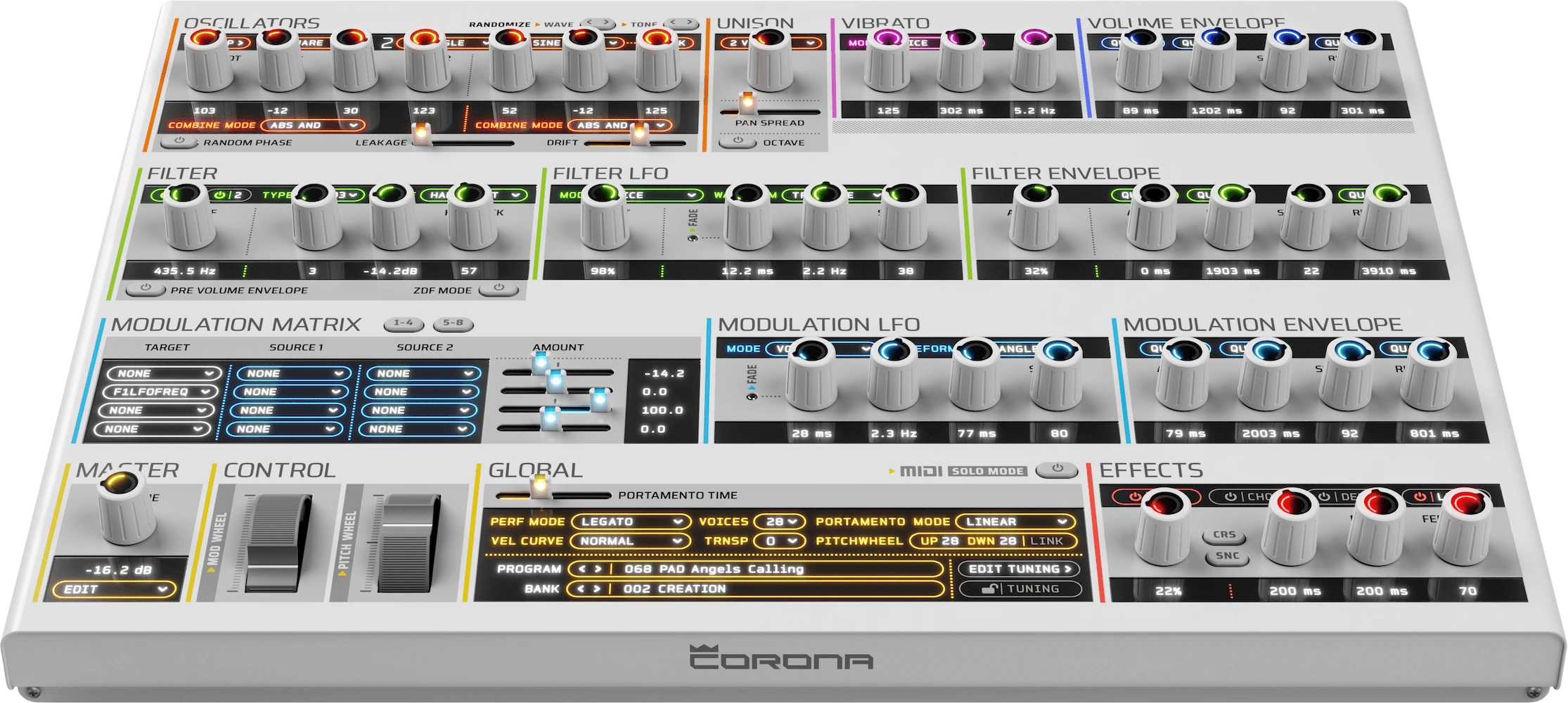Add your SoundFont 2 or WAV files to Corona oscillators and boost timbres to never-before-heard levels.