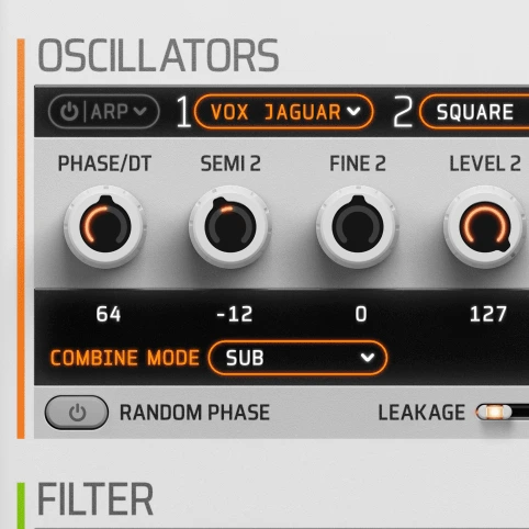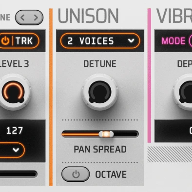 Dedicated Unison unit to make sounds spread across the stereo mix with selectable octave spread, voices, detune knob and panning spread controls.