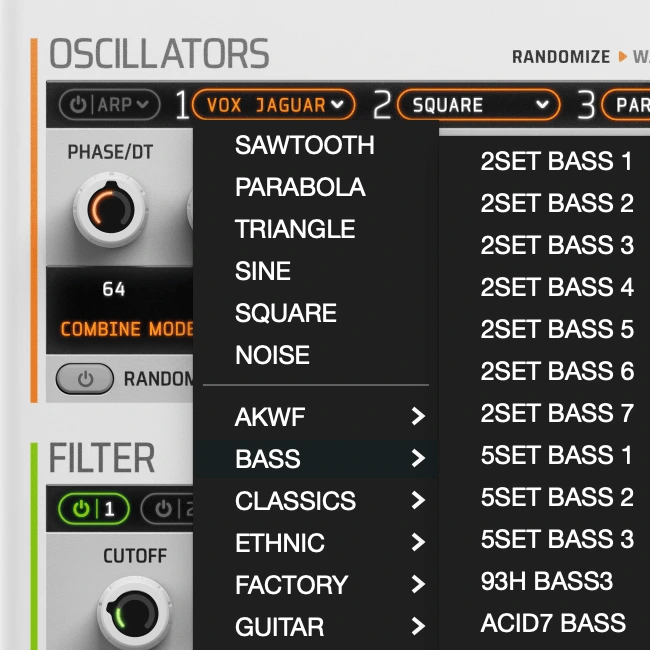 Also, from classic VA saw, triangle, square, sine, parabola and noise to the included waveforms in two extra DWB banks with 300+ timbres from: