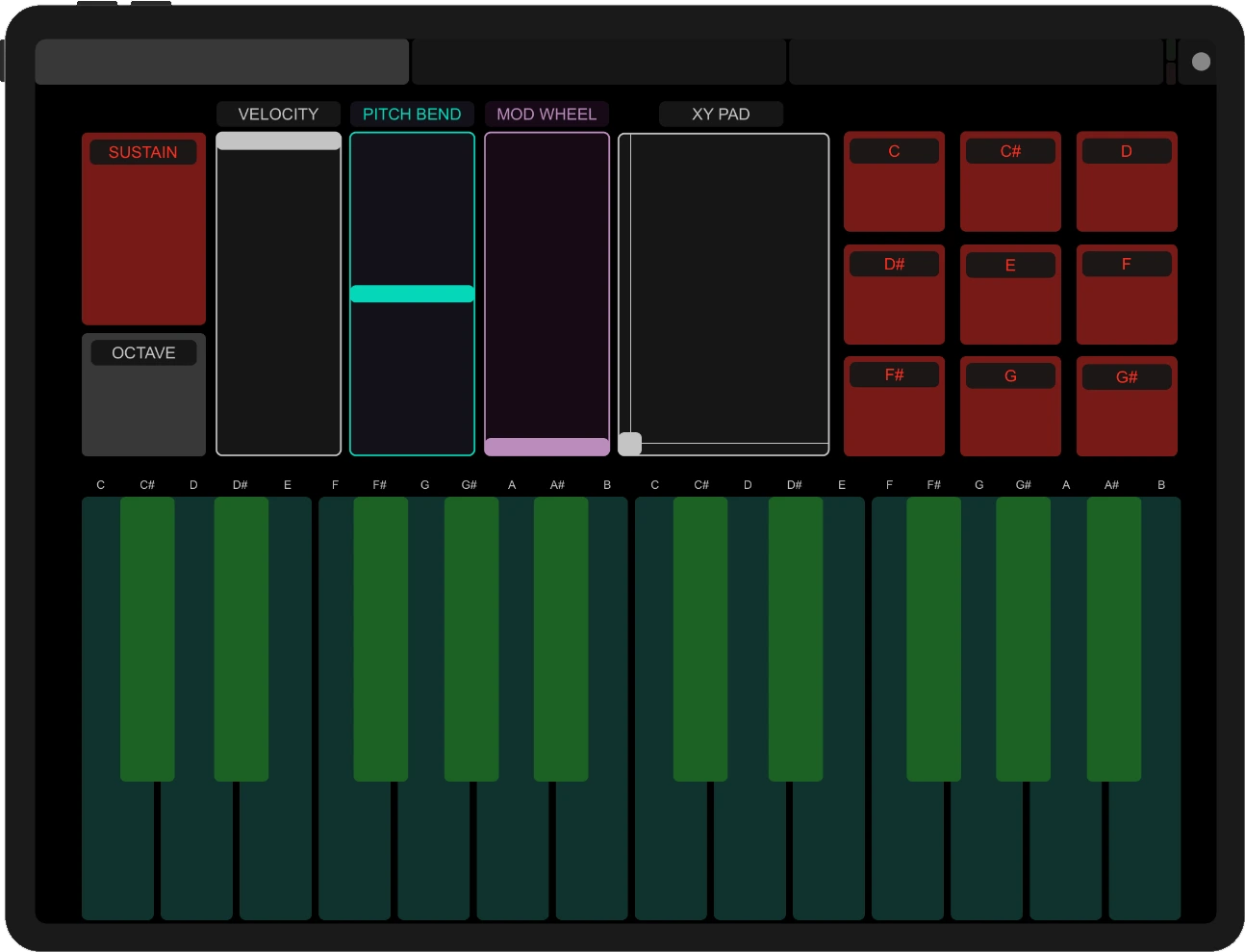 - 2 Oktaven Tastatur (C3-C5 aufgeteilt in zwei Tabs).