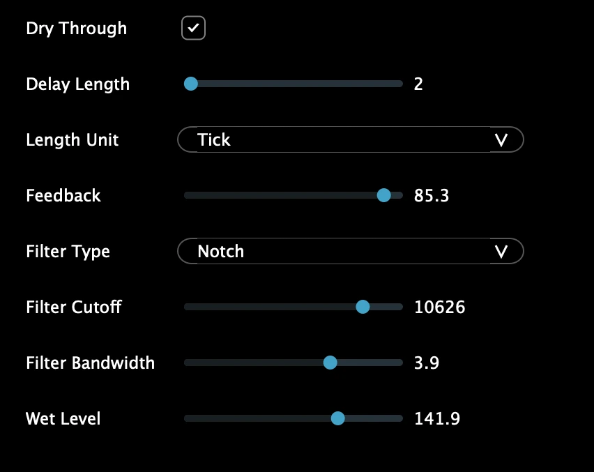 With control over feedback, filter cutoff, and bandwidth, you can craft anything from short, subtle echoes to resonant, immersive soundscapes. High feedback settings with band-pass filtering can mimic spring reverb tones or tape-echo warbles, while moderate feedback and high wet levels deliver the deep 'dub echo' sound iconic in reggae, techno, and psychedelic music.
