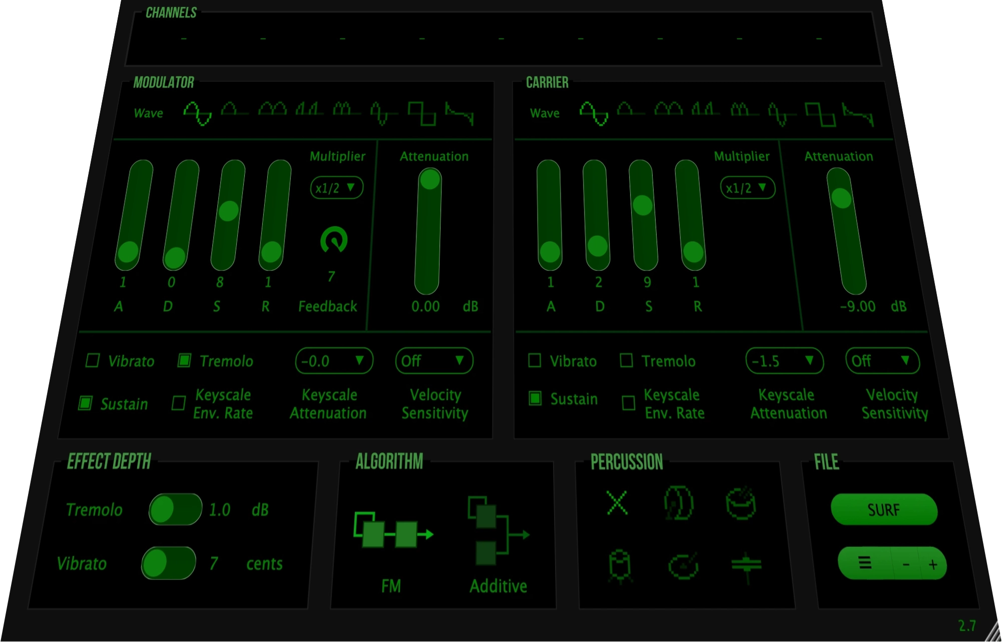 This instrument provides an emulated OPL sound chip, offering all features of the OPL2 and some features of the OPL3. It supports importing SBI files, an instrument file format developed by Creative Labs for the Sound Blaster, which serve as presets for this plugin. Simply drag and drop the SBI files into the plugin window to use them.