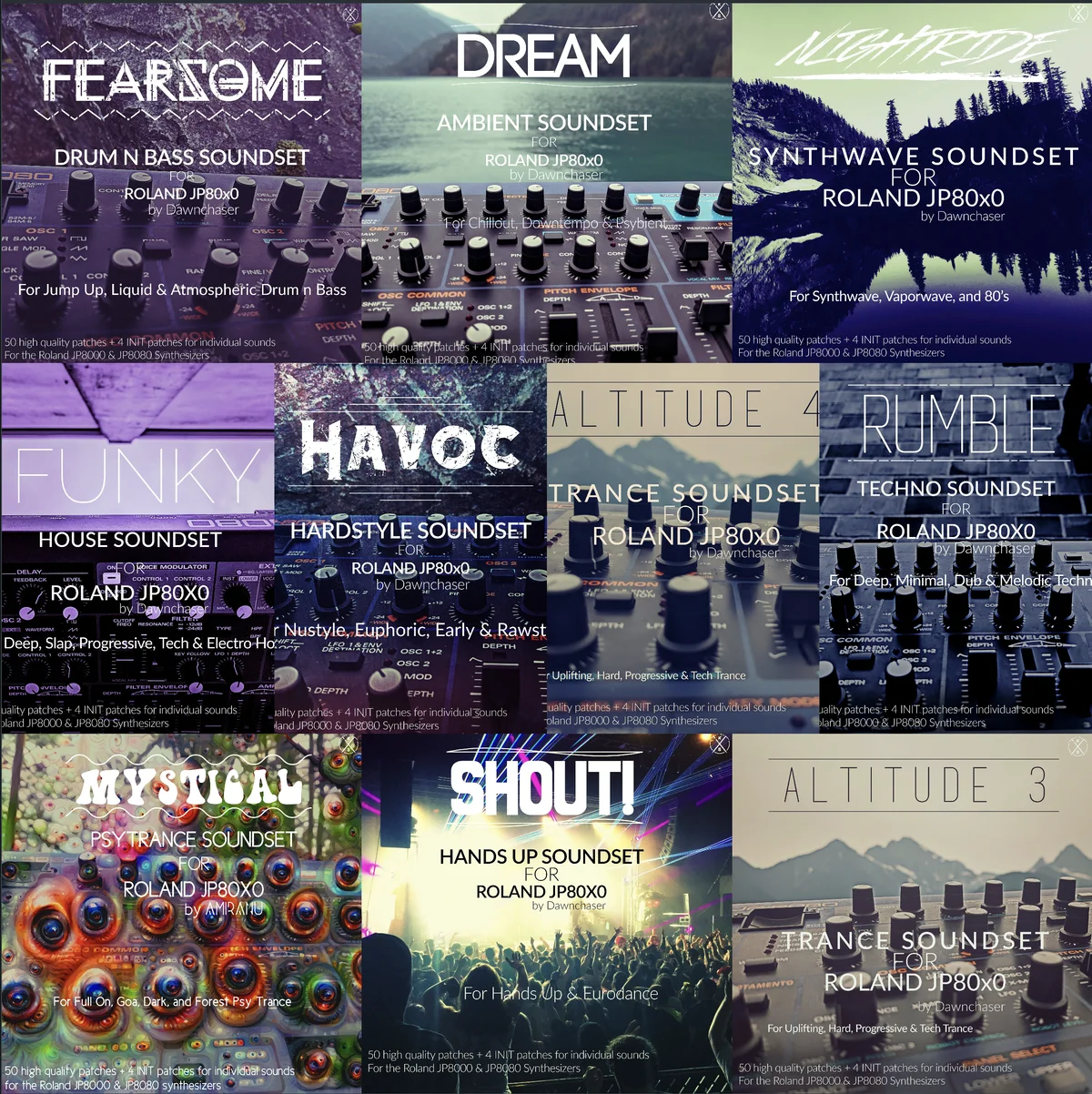 Professional soundsets for the Roland JP8000/JP8080 hardware synthesizers and compatible virtual instruments including DiscoDSP Corona, which can import the included .syx files. Each soundset contains approximately 50 genre-specific dual-layer performances priced at $27, covering Hardstyle (Havoc), Psytrance (Mystical), House (Funky), Techno (Rumble), Synthwave/80s (Nightride), and Ambient/Downtempo (Dream). All performances are 100% genre-focused, royalty-free, and organized by category.